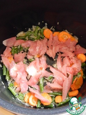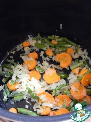 Небольшую морковь нарезать кружочками, добавить вместе с фасолью к луку и чесноку. Немного поджарить.