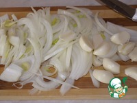 Лук почистить и порезать полукольцами, чеснок почистить и порезать на поперек. В сковороду налить растительного масла, нагреть. Выложить чеснок и лук, на среднем огне начинаем обжаривать.