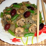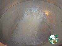 В это время фунчозу заливаем кипятком, она должна как минимум 5 минут пропариться. Пока фунчоза настаивается, мы продолжаем готовить.