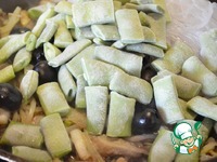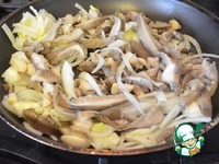 Нарезаем грибы, добавляем к луку, и обжариваем.