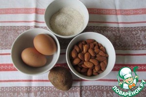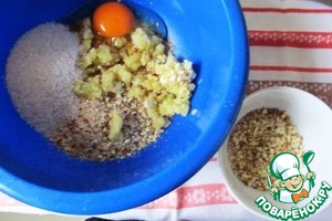 В миску отправляем молотый миндаль, картофельное пюре, сахар и яйцо.