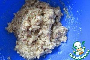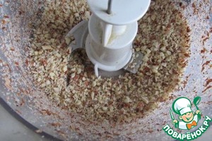 Миндаль измельчаем в мелкую крошку. Две столовых ложки откладываем в отдельную чашечку. -
