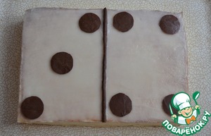 Для начала я на пергаменте отметила размер моего домино. За шаблон брала лист А4. Взбила белки с сахарной пудрой и выложила на пергаменте, по намеченному прямоугольнику, безе. Испекла 2 таких коржа. 1 корж печется 1 час при 120 градусах.