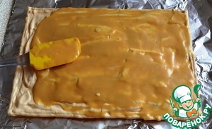 А потом испекла 2 медовых коржа. Желтки взбить с сахаром, добавить мед, масло, хорошо перемешать. 100 г муки просеять с разрыхлителем, перемешать. Добавляя понемногу муку замесить эластичное тесто, не липнущее к рукам. Его немного, но мы же будем раскатывать очень тоненькие коржи. Выпекать при 180 градусах 10 минут. Ах, какой был аромат!