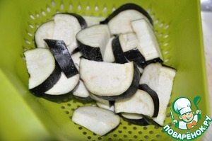 Баклажаны режем полукольцами, засыпаем солью, перемешиваем и отставляем на 30 минут, чтобы вышла горечь.
