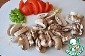 Помидоры нарезаем сегментами такими же по размеру, как шампиньоны. -