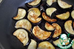 На горячую сковороду наливаем растительное масло и выкладываем баклажаны в один слой. Поджариваем баклажаны до румяности, переворачиваем.