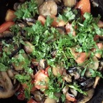 Всё перемешиваем, обжаривая на сильном огне пару минут. Помидоры не должны размякнуть и стать соусом. -