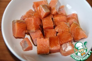 Берём рыбу лососёвых пород, у меня кета. Чистим, аккуратно острым ножом удаляем кости и кожу и нарезаем кубиками.