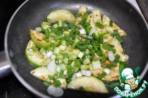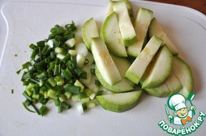 Молодые цуккини нарезаем полосками, зелёный лук колечками.