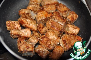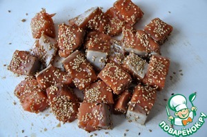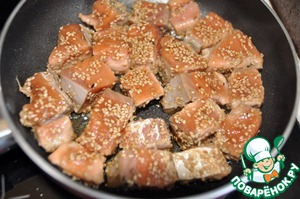 Рыбу засыпаем кунжутом так, чтобы все кусочки равномерно были покрыты семенами. Кунжут должен "прилипнуть" к рыбе.