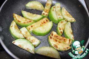 На сковороду наливаем растительное масло, кладём цуккини и обжариваем с обоих сторон до золотистого цвета.
