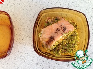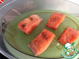 Поверхность пароварки смазываем небольшим количеством растительного масла, чтобы рыба не прилипла в процессе варки. Укладываем наши мини-стейки в пароварку кожицей вниз, солим и перчим по вкусу. Устанавливаем время 10-15 минут, в зависимости от Ваших предпочтений к степени готовности. Говорят, что рыбе хватает и 5 минут, но я не рискую - у меня пароварка только минуты 3 "разогревается".