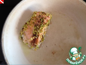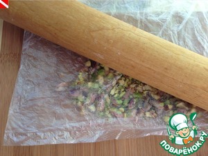 Тем временем подготавливаем фисташки: (я брала фисташки соленые, которые продают к пиву, поэтому филе посолила совсем чуть-чуть) их необходимо измельчить. Самый простой способ, менее трудозатратный в плане мойки посуды - насыпать орехи в пакет и раскатать скалкой. Конечно, если Вам нужно измельчить большее количество, то лучше использовать блендер.