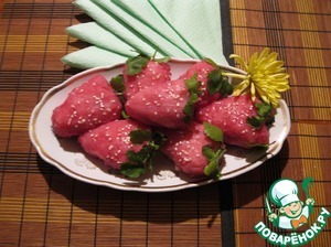 Оформление. Каждую "клубнику" обмакнуть в свекольный сок, слегка присыпать кунжутом, приделать хвостики из петрушки (у меня кинза).