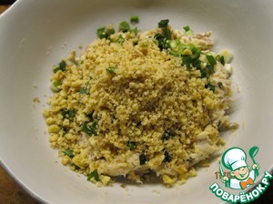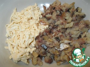 Очищенную скумбрию мелко нарезаем, разминаем с плавленными сырками.