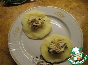Из картофельного пюре лепим плоские лепешки. На каждую кладём по 1 ч. лож. начинки.