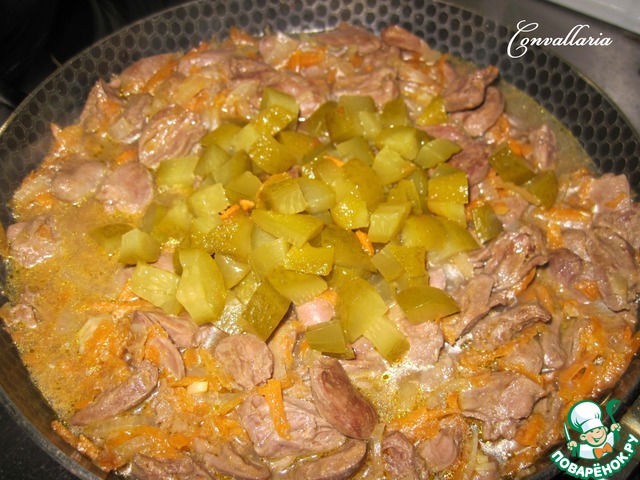 Соленые огурцы нарезать кубиками, переложить в сковороду и тушить под закрытой крышкой еще 10 минут.