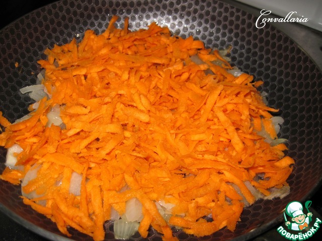 Морковь очистить от кожуры и натереть на крупной терке, добавить к луку.