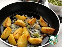 Как только картофель подрумянится, добавить лук, прожарить минуты 2-3. |