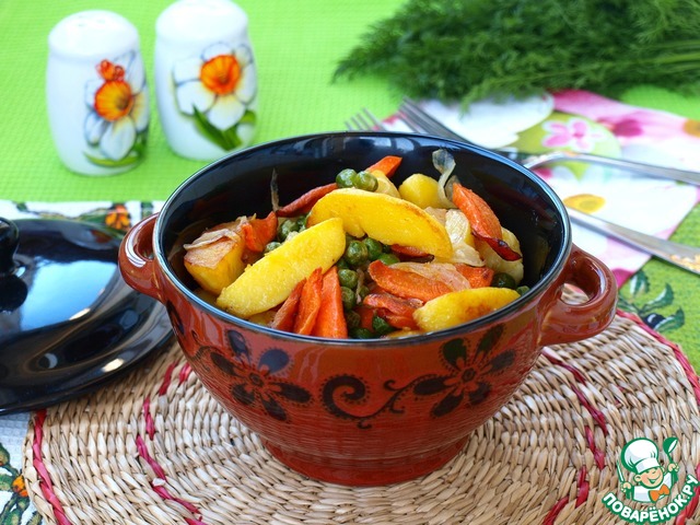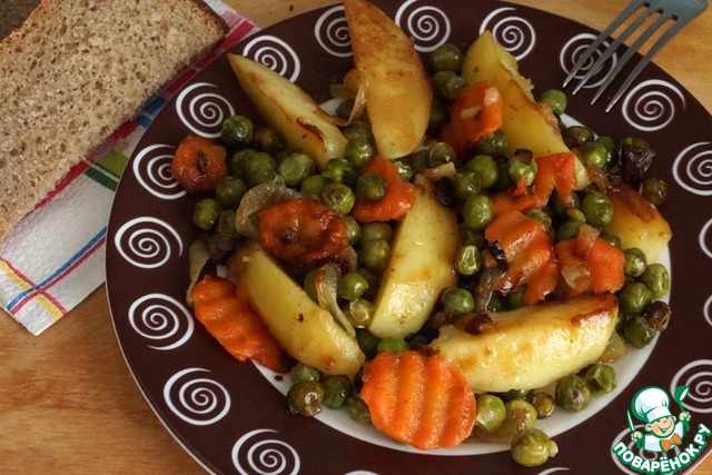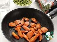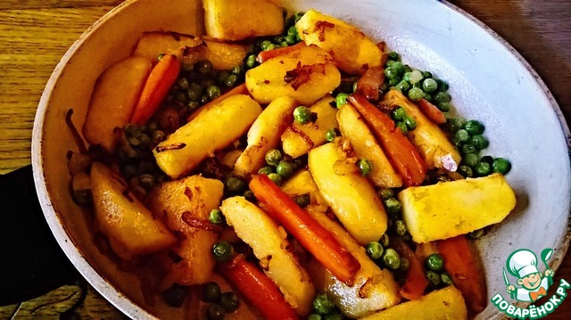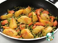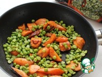 К поджаренной моркови добавить горох, 3-4 столовые ложки воды, накрыть крышкой и потушить минут 5. |