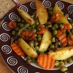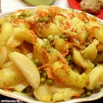 Пока горошек отмокает, помыть и отварить картофель в мундире, очистить от шкурки, нарезать дольками. |