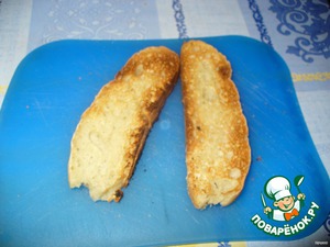 Кусочки белого хлеба поджарить в тостере. Лучше использовать чиабатту, как её испечь, можно посмотреть, например, здесь https://www.povarenok.ru/recipes/show/8314/