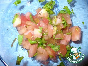 Помидоры ошпарить кипятком, сразу ополоснуть холодной водой, очистить от шкурки, мякоть нарезать мелкими кубиками, смешать в миске с нарезанной зеленью, посолить, поперчить.