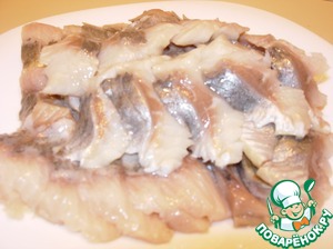 - Сельдь (филе, слабосоленая в масле) — 300 г