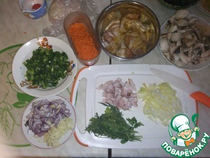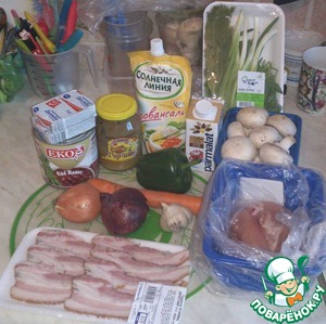 • Режем филе на порционные небольшие куски, трем морковь на средней терке, лук на четвертькольца, перец мелко, режем грудинку, лук, шампиньоны, чеснок и подготавливаем зелень - она нам пригодится позже.