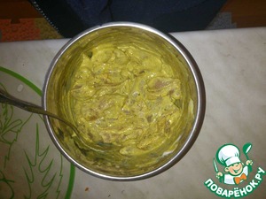 • Подготовим маринад для филе: горчицу смешиваем с майонезом. Далее соль, черный перец и специи для жарки курицы (у меня обычный набор - французские травы+куркума+базили к+паприка+кумин). У каждого набор может быть свой. Далее маринад выливаем в чашу с кусками филе и тщательно перемешиваем. Убираем в холодильник минут на 20.