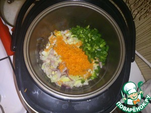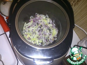 • Приступим к жарке. Ставим мультю в режим "Жарка", наливаем немного растительного масла и обжариваем лук с чесноком до прозрачности.