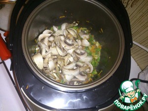 Далее добавляем грибы. Чуть присолим и поперчим.