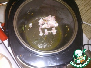 • Как грибы зазолотились (ну, почти готовы), выкладываем овощную смесь в отдельную посуду. Подливаем (если нужно) масла и начинаем обжаривать грудинку до полупрозрачности.