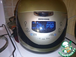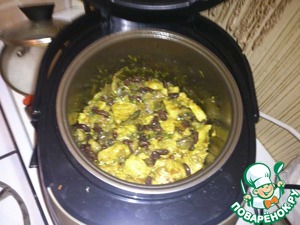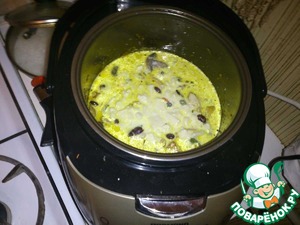 • Ставим мультю в режим "Тушение" или "Выпечка" на 50 минут. К мясу добавляем наши обжаренные овощи, перемешиваем и заливаем сливками с сыром. Закрываем крышку и 40 минут отдыхаем.