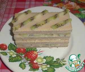 Сверху кладем вафлю, слой сгущенки и кусочки киви.