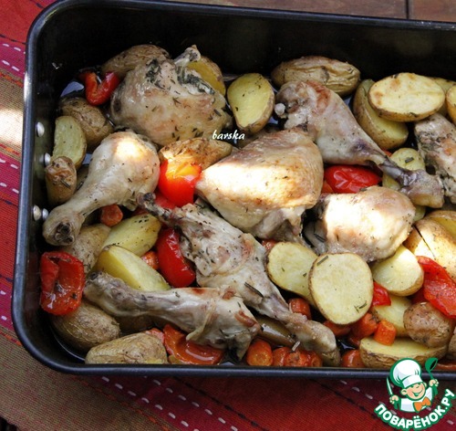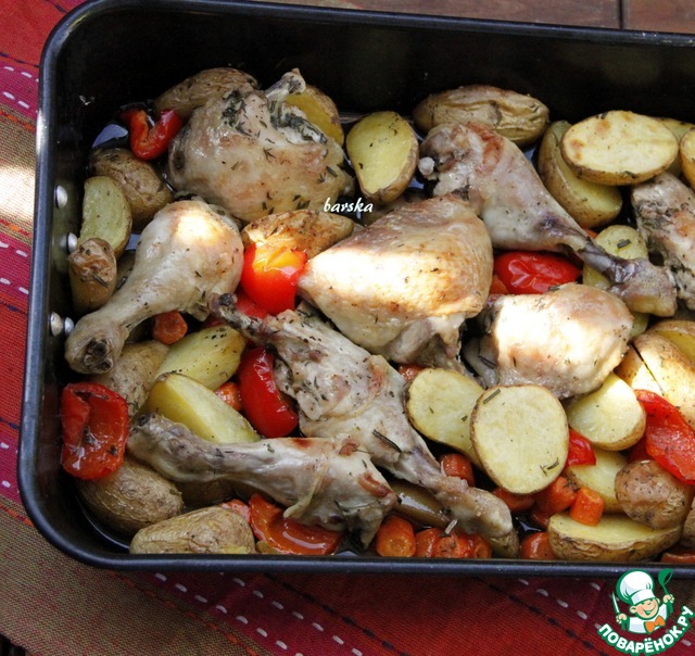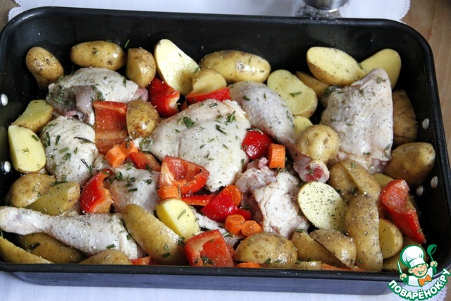Добавить морковь, паприку и картофель на противень к окорочкам.