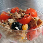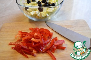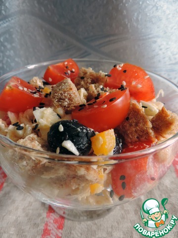 В миске перемешать все ингредиенты: помидоры черри, маслины, яйца, сладкий перец, хлеб, капусту.