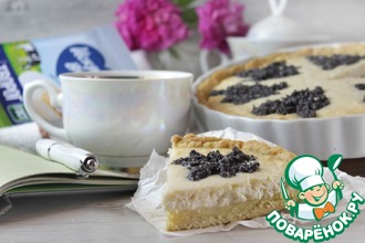 Творожную массу выливаем на тесто и ставим в духовку примерно на 30 минут при температуре 170-180 градусов. Под решетку с формой я ставила противень. Ориентируемся на цвет теста и легкий загар по краям на поверхности пирога.