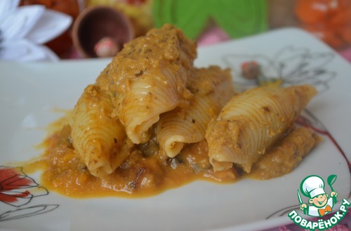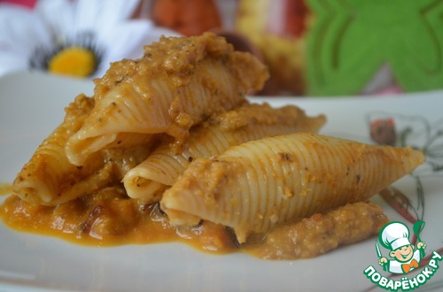 Приглашаю вас попробовать нежнейшую пасту с горячим бархатистым соусом. Конкилье (большие ракушки), в основном, принято фаршировать и запекать, но я предлагаю вам их с густым соусом по рецепту Ю. Высоцкой.