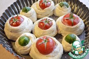 Раскатать кружок, по центру расположить помидор, сделать ножом три надреза как на фотографии