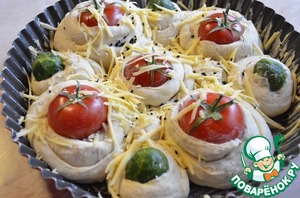 Обернуть каждой частью теста помидор.
