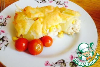 Как только куриное филе обжарили, добавляем картофель, перемешиваем, заливаем воды так, чтобы вода еле прикрывала овощи с курицей.