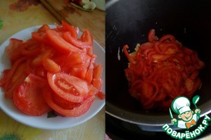 • Добавить нарезанные ломтиками помидоры и все хо­рошо перемешать. Тушить в этом же режиме минут 5-7, поперчить и посолить по вкусу. Затем выложить полученную массу в отдельное блюдо
