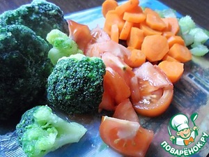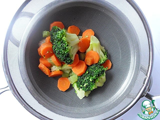 Воду в кастрюльке доводим до кипения, бросаем в нее нарезанные морковь, сельдерей и соцветия брокколи, доводим до кипения и варим 2 минуты, после чего откидываем овощи на сито, чтобы стекла лишняя жидкость.