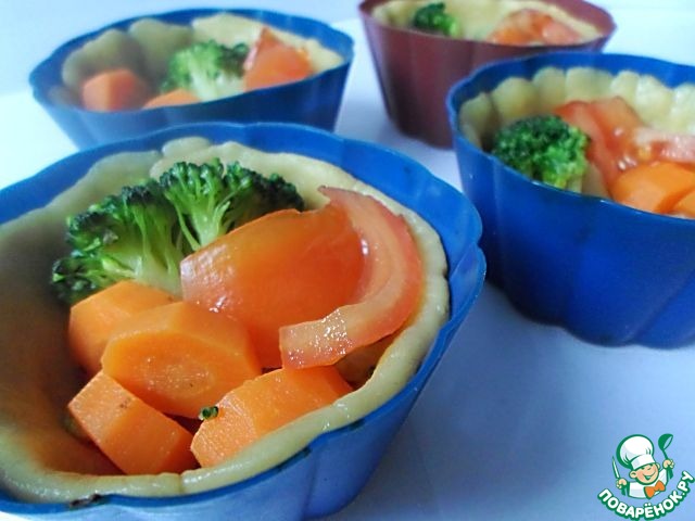Тесто достаем из холодильника, делим на 8 равных частей, каждую часть раскатываем и распределяем по формочкам для маффинов. Для этих пирогов лучше всего подойдут формочки среднего размера, совсем маленькие брать не стоит. Если Вы используете не силиконовые формочки, перед использованием смажьте их сливочным маслом и присыпьте мукой. На тесто выкладываем овощное ассорти, чтобы в каждом пироге оказалось понемногу каждого вида овощей.