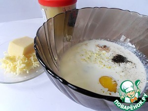 Сыр трем на средней терке. Взбиваем отдельно в мисочке сливки, сметану, 2 яйца, горчицу, а также специи и соль по вкусу.