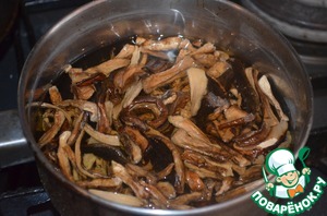 Сухие грибы залить горячей водой и поварить на среднем огне примерно 20-30 минут.