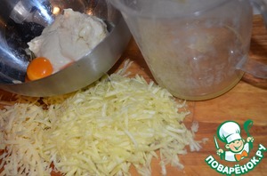 Кабачок и половину сыра (вторая половина пойдет в начинку + 2 ст. л. на рулет сверху) перемешать с тестом.