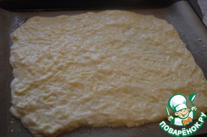 На противень положить пергаментную бумагу, смазать 1 ст. л. оливкового масла. Выложить кабачковое тесто и поставить в духовку на 10-25 мин. Такой разброс времени обусловлен разностью духовок: в электрической духовке тесто пропечется и подрумянится с обеих сторон за 10 мин, в моей же, газовой старой духовке пропеклось за 25 мин, но так сверху и не подрумянилось :-)